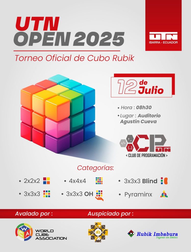 Club de Programación UTN te Invita a formar parte de un nuevo Torneo Oficial de Cubo Rubik, el #UTNOpen2025, avalado por la WCA ( World Cube Association), a desarrollarse en la Ciudad de Ibarra en el Auditorio Agustin Cueva de la Universidad Técnica del Norte Atrévete a romper tus límites, prueba tu ingenio.Inscripciones WCA: https://acortar.link/INZ4cUFecha Límite de inscripciones: 6 de julio de 2025, 19:00 GMT-5Club de Programación UTN con el auspicio de Rubik Imbabura apoyando la práctica del speedcubing y el desarrollo intelectual de toda la juventud de nuestra Universidad y el norte del pais.